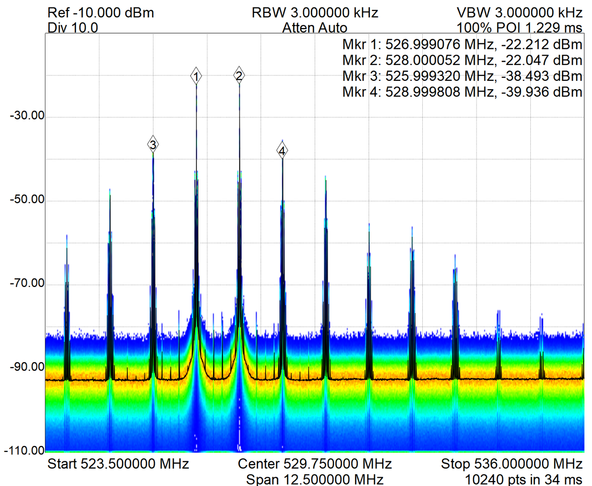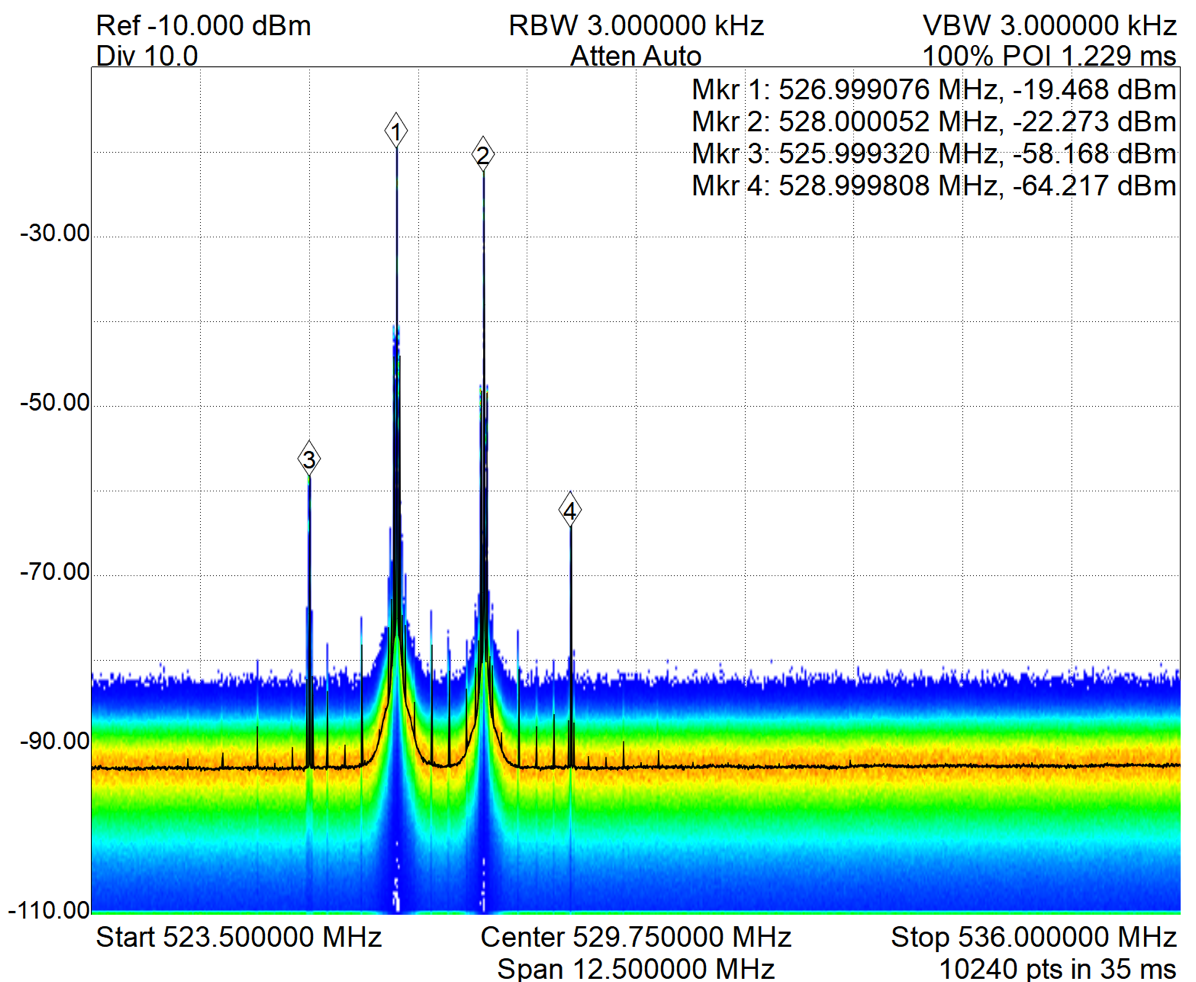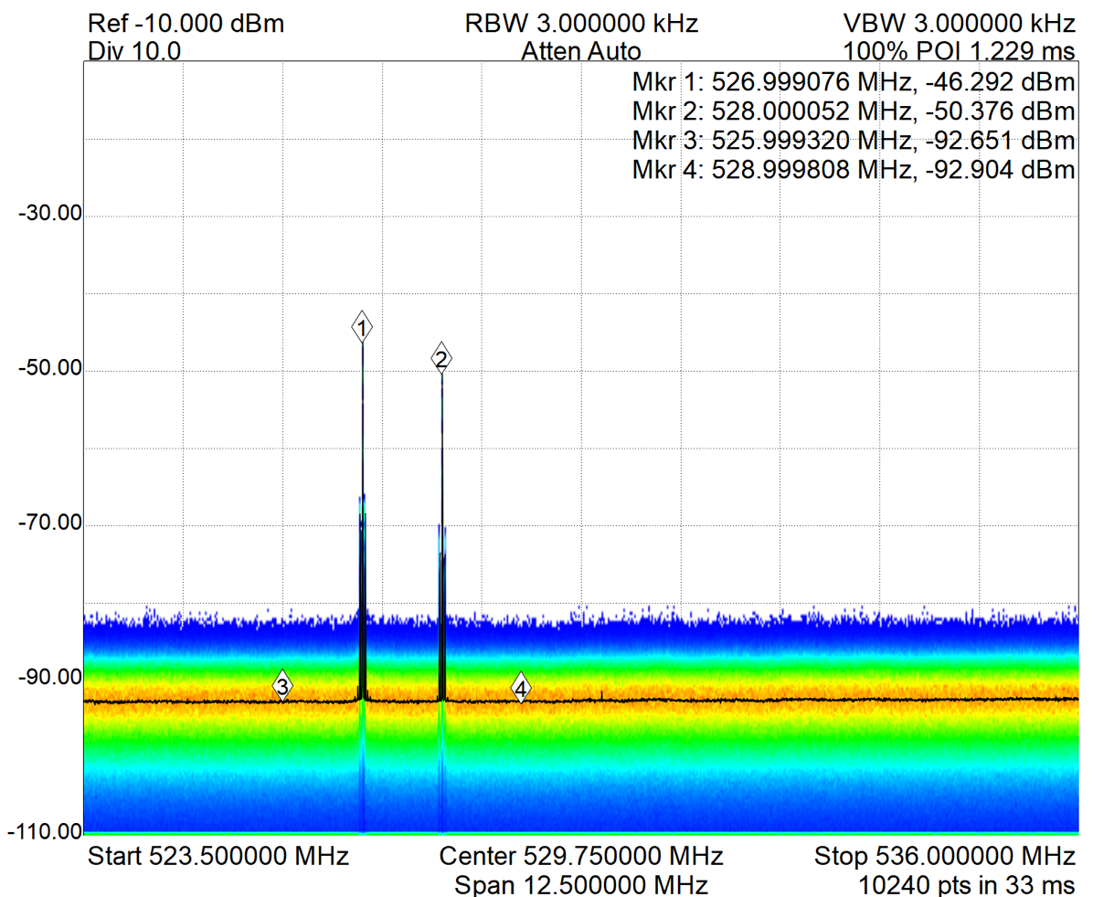 Note: These results were not as expected and the IMDs are of higher power than in test #1. This method is often seen in practice and it is commonly assumed that this method would reduce the generation of IMDs testing does not support this.