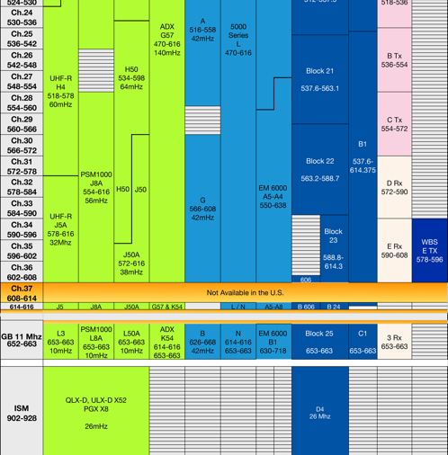 This reference shows popular frequency bands for RF microphones, IEMs, and Coms. Manufactures such as Shure, Sennheiser, Lectrosonics, RTS, Clear-Com, & Others are referenced in this page. Spectral bands include UHF, ISM, DECT, and 2.4 gHz bands.