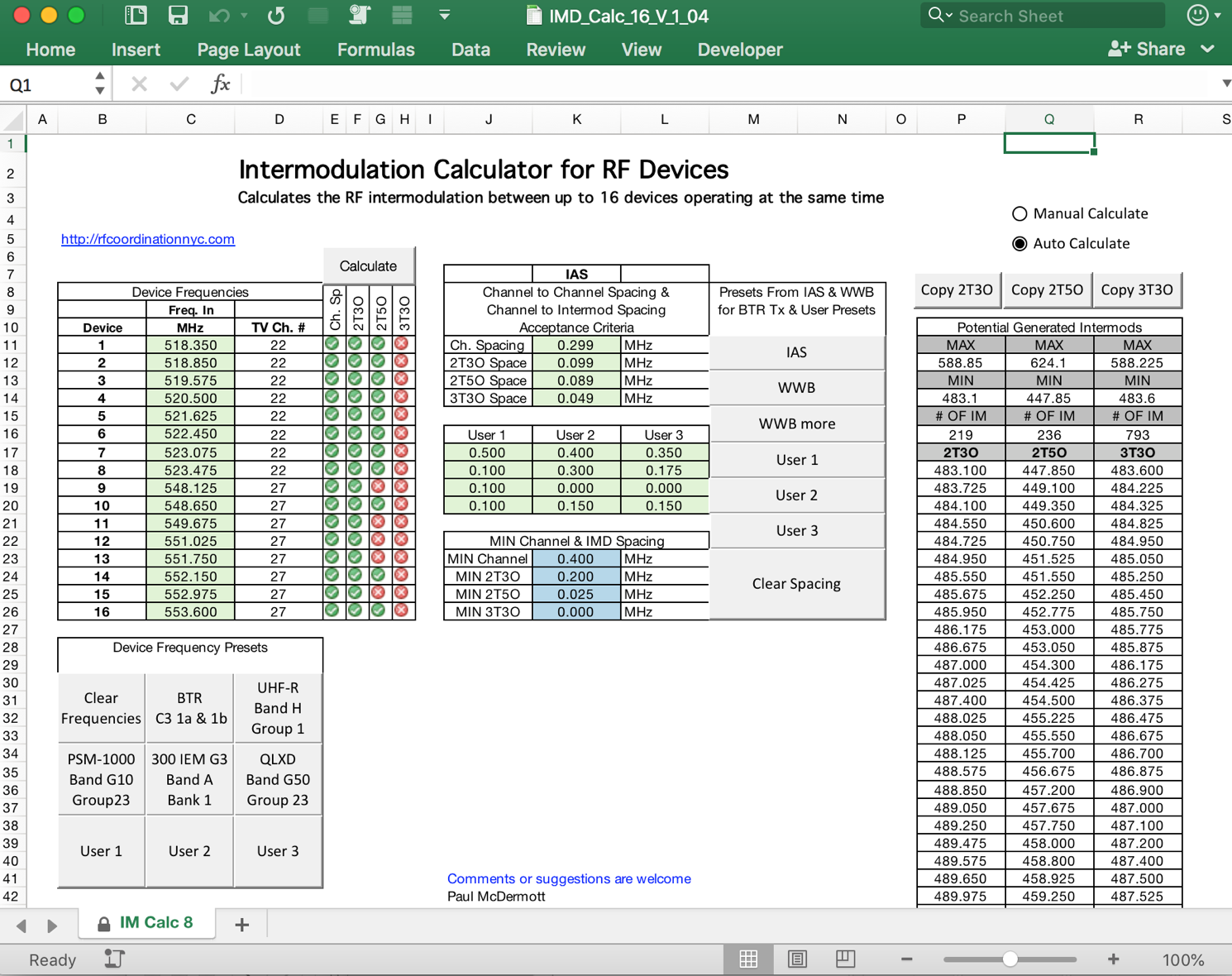 Excel Spreadsheet that calculates 2T30, 2T50, and 3T30 IMD’s for up to 16 device frequencies.